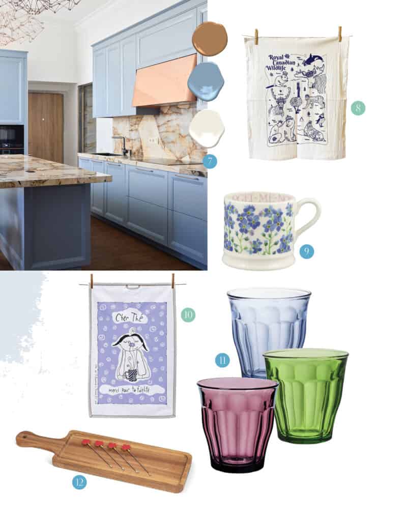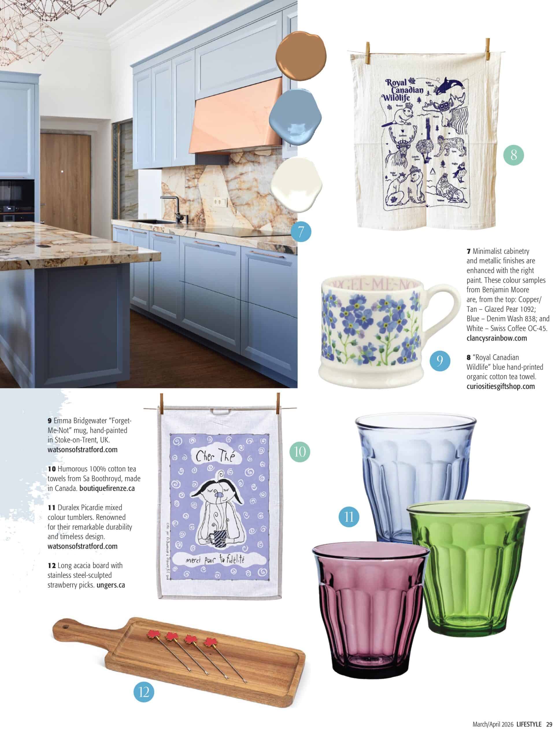 7 Minimalist cabinetry and metallic finishes are enhanced with the right paint. These colour samples from Benjamin Moore are, from the top: Copper/Tan – Glazed Pear 1092; Blue – Denim Wash 838; and White – Swiss Coffee OC-45.