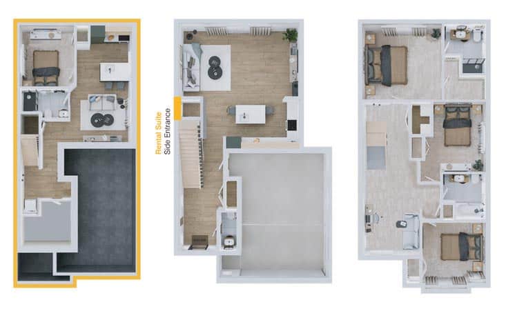 Ironstone’s Monterey Flex Haus floor plans show the basement as a fully independent rental suite with generous living space on the first and second floor.