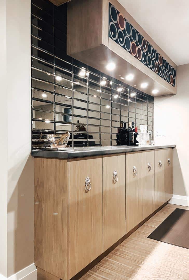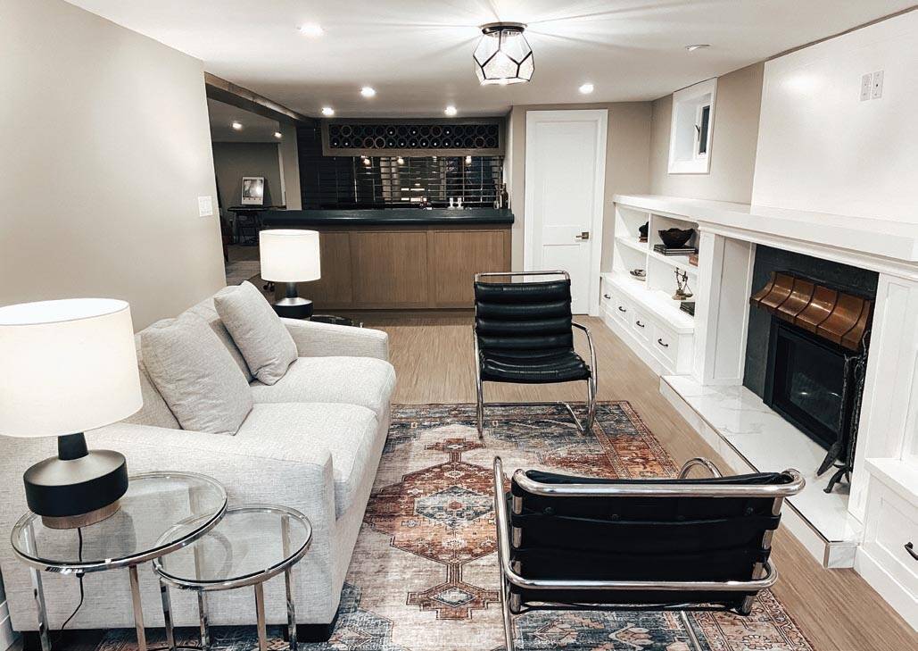 “Adding a bar is always popular — a bar, living space, bedroom and bath are a standard layout.” Upgrading millwork to match upstairs décor, add a feature wall and amenities such as a fireplace are also big asks. “Offices are another big one — they’re a great space to add. It’s hard to carve out an office upstairs.”