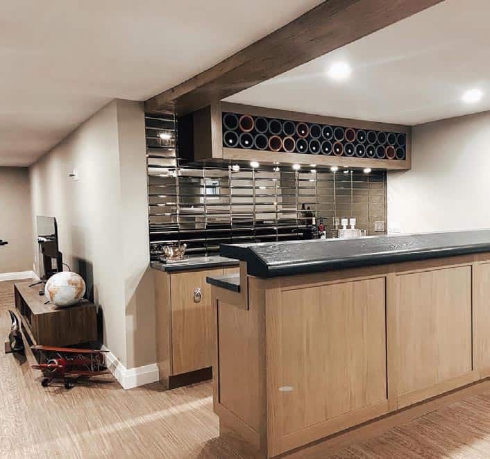 This Riverside Construction full basement renovation includes a generous family room that opens to a stylish bar.