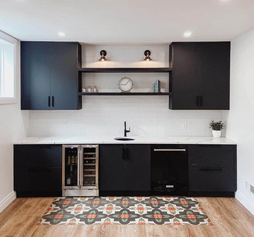A simple bar sink in the middle of a long countertop with a beverage cooler and dishwasher balance beautifully with upper cabinets and open shelving.