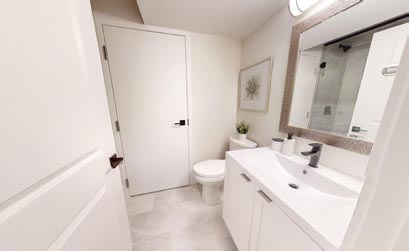 A feeling of spaciousness in the Graystone Homes Lotus Towns model suite bathroom is enhanced by a full-height glass shower wall.