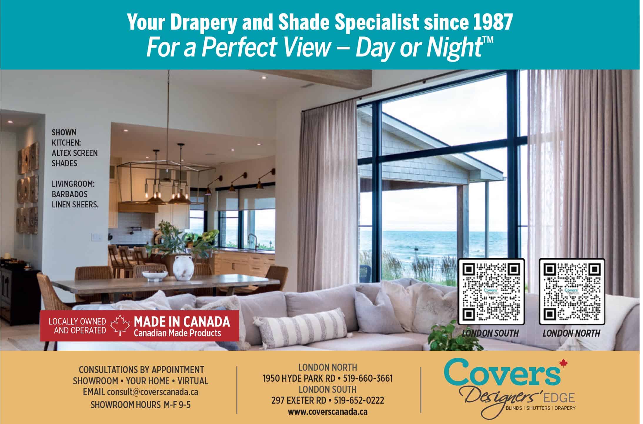 The gorgeous white-toned kitchen is a London Home Builders’ Association award winner. It won Best Renovated Kitchen over $75,000 in 2023 for Melchers, LKS, and Sloan Stone Design. It features plenty of upper and lower cabinets as well as a built-in refrigerator and wine cooler. Gold and black pulls and sconces add a touch of glamor against the serenity and subtle texture of the delicately veined quartz countertops. Cabinets are a complimentary mixture of Oyster paint on MDF and Cashew Stain on cherry wood.