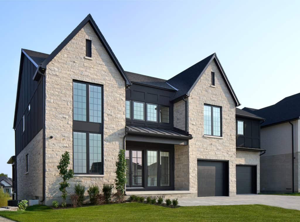 • The exterior mixes light stone, cream siding and adds a gable and peaked roofline for curb appeal