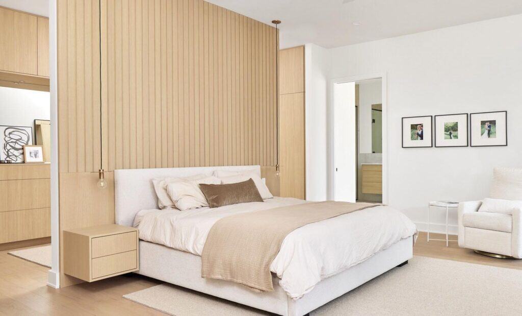 • Ensuite uses fluted tiles, soft neutrals and light wood