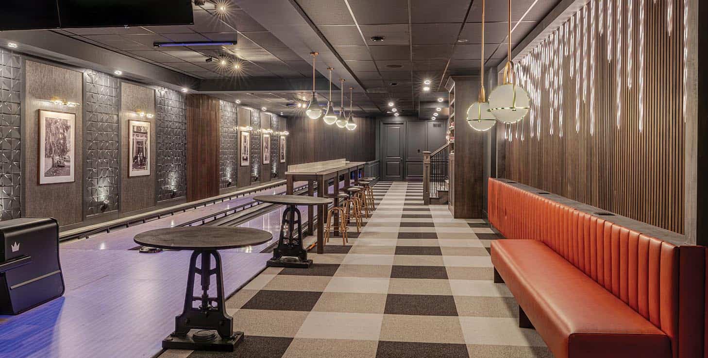 • Bowling alley with built-in banquette, bar-style table and stools, dramatic lighting and walls
