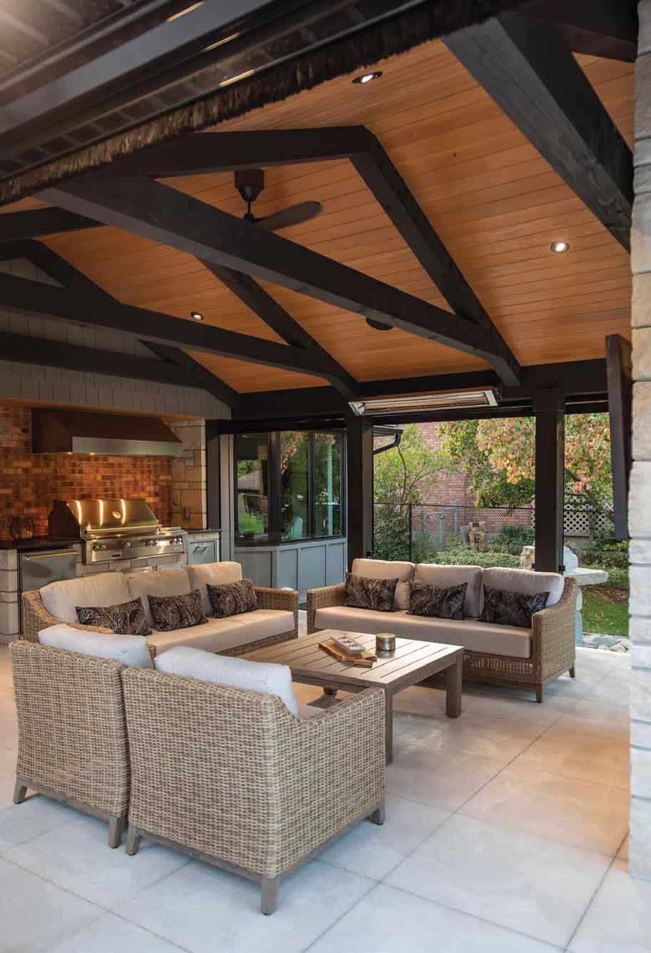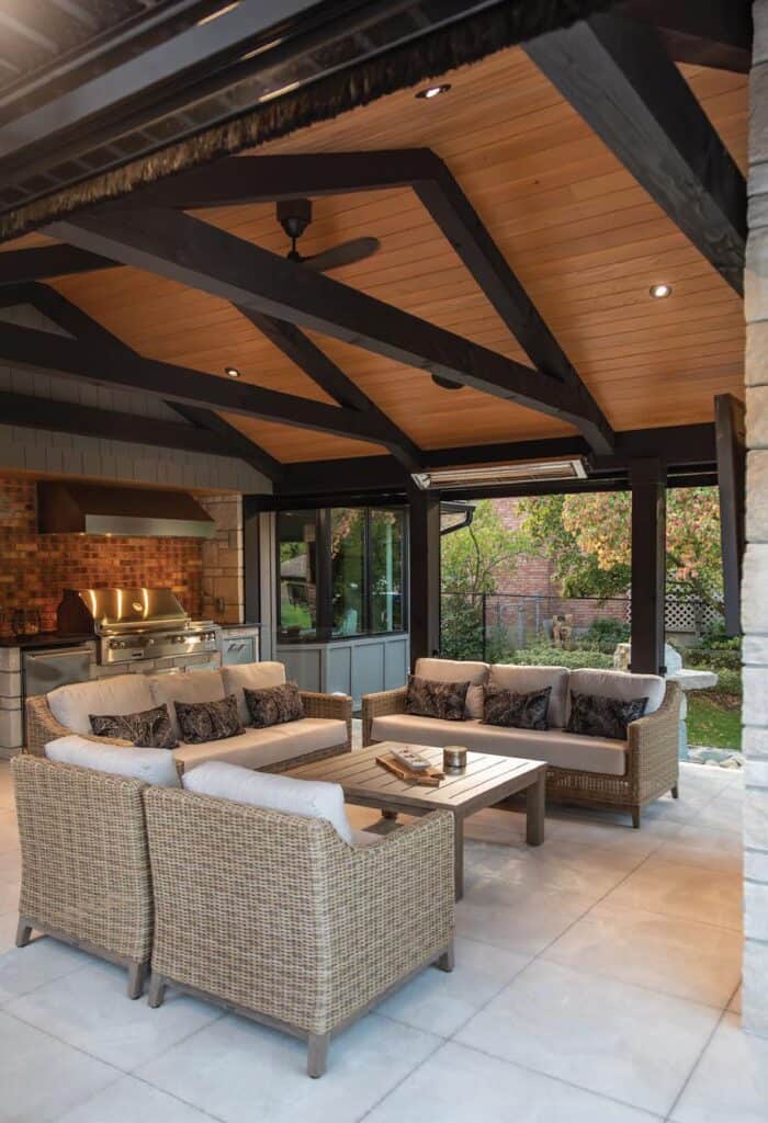 • Enclosed kitchen with a barbecue, refrigerator and seating area under a vaulted and beamed ceiling and enclosed by screens when needed