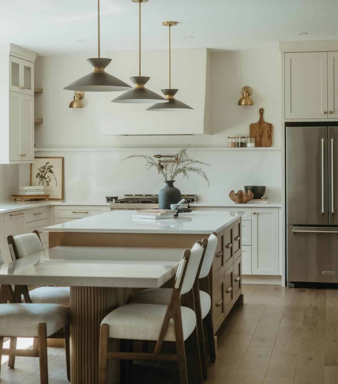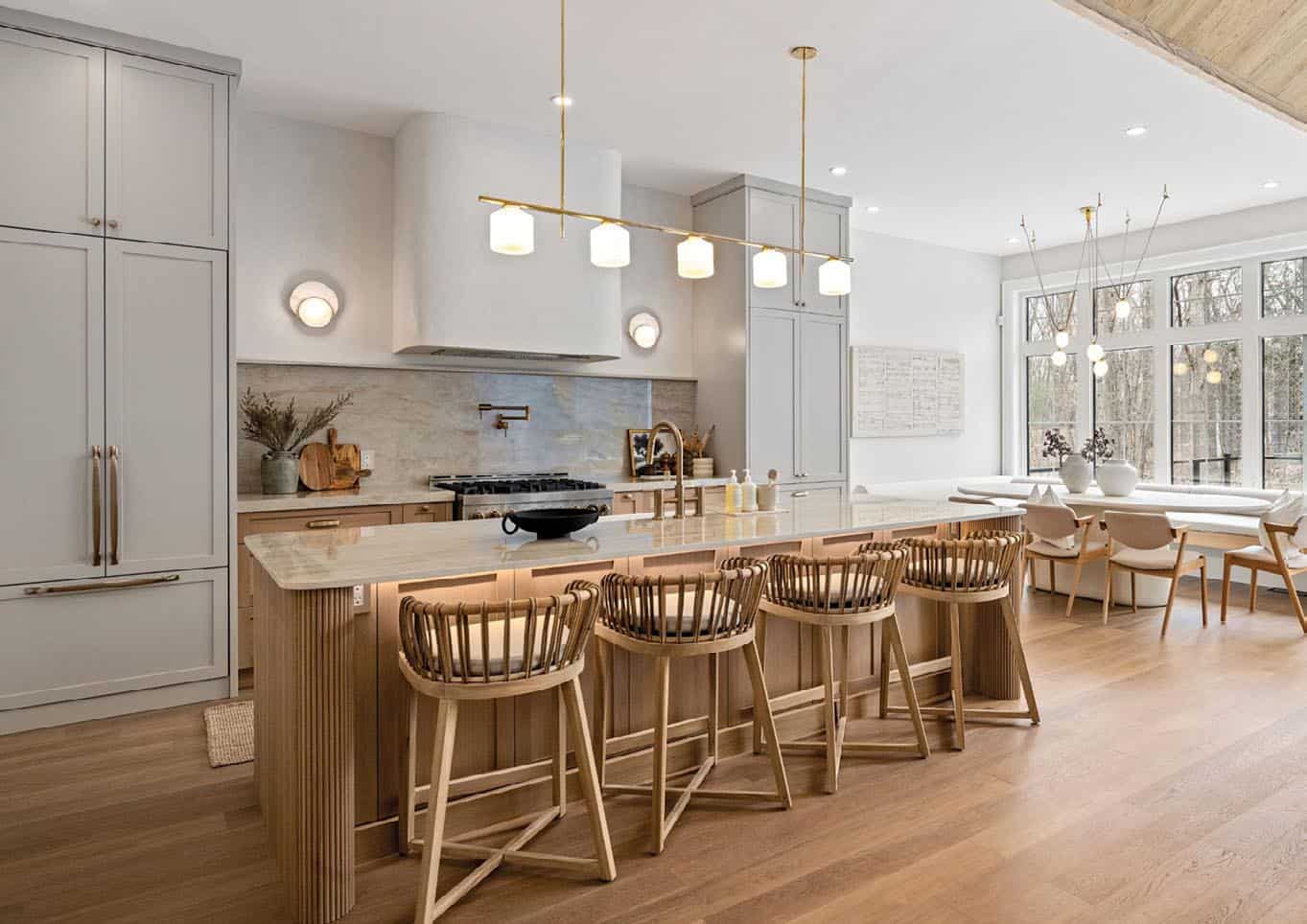 • The Refined Countryside Kitchen is created with a soft creamy palette, warm wood and brass accents