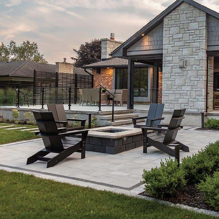 • Applying indoor amenities in outdoor “rooms” for dining, seating around a firepit, and a garden on stone-paved, varied levels