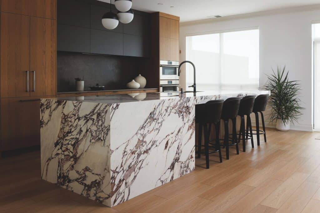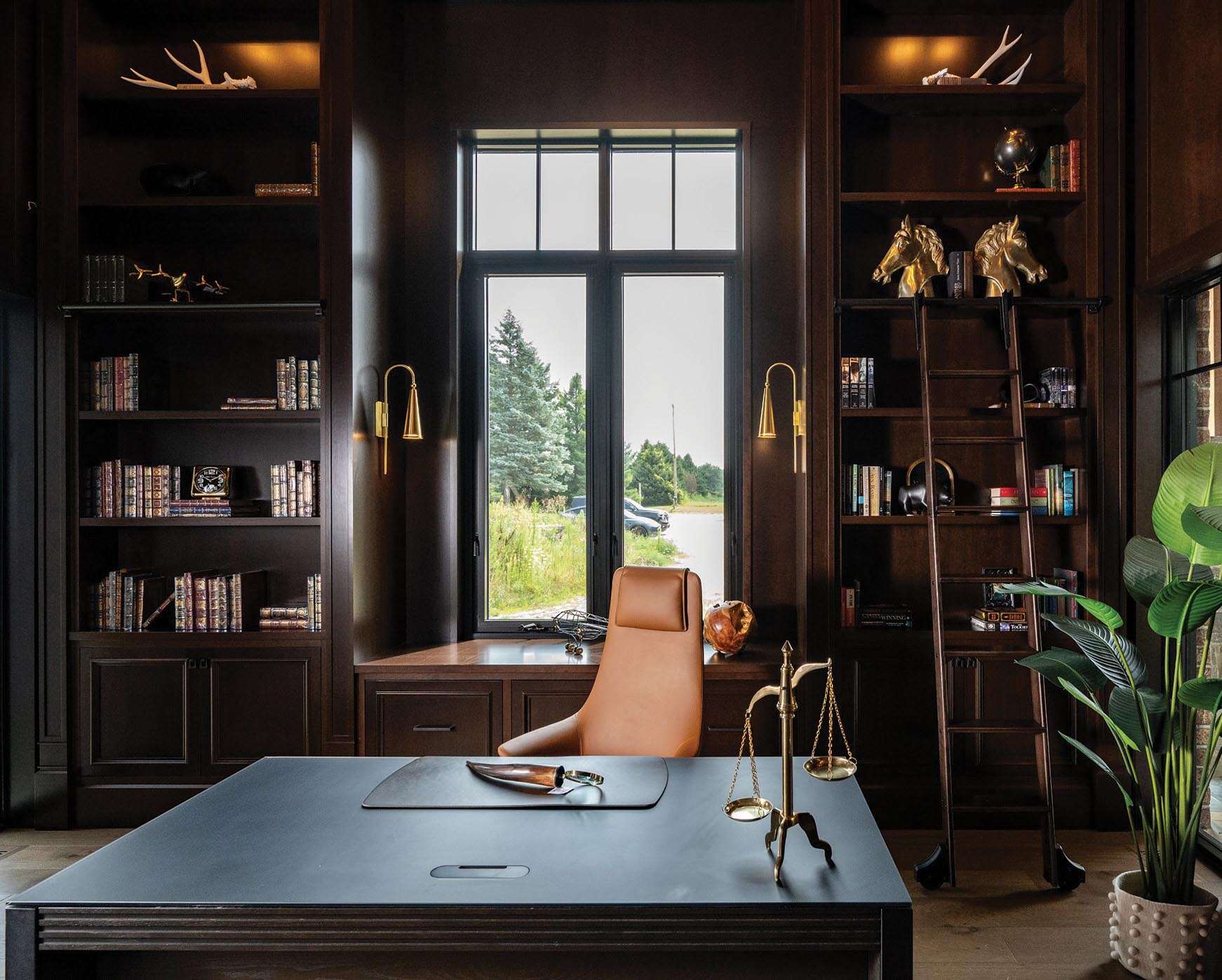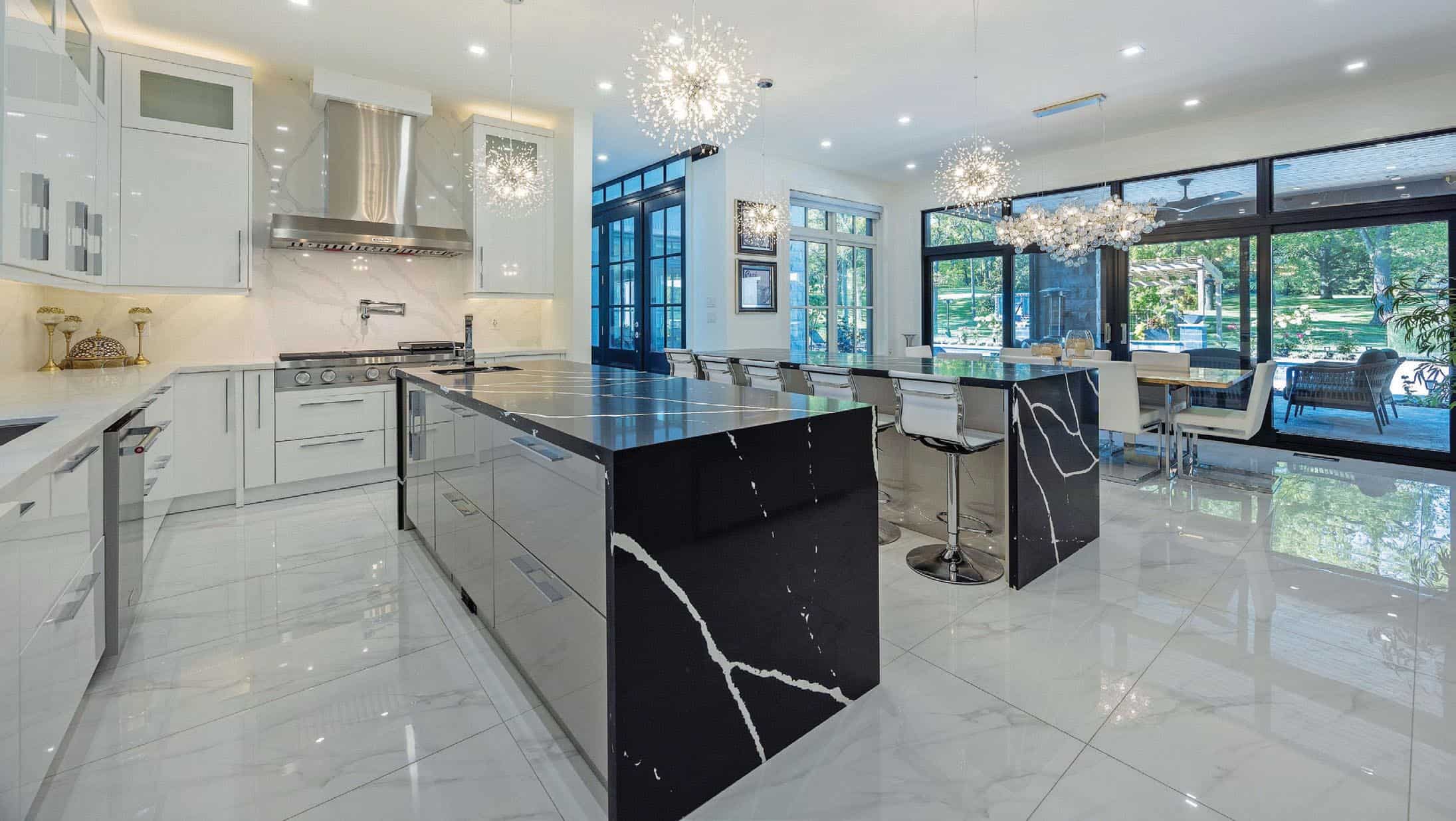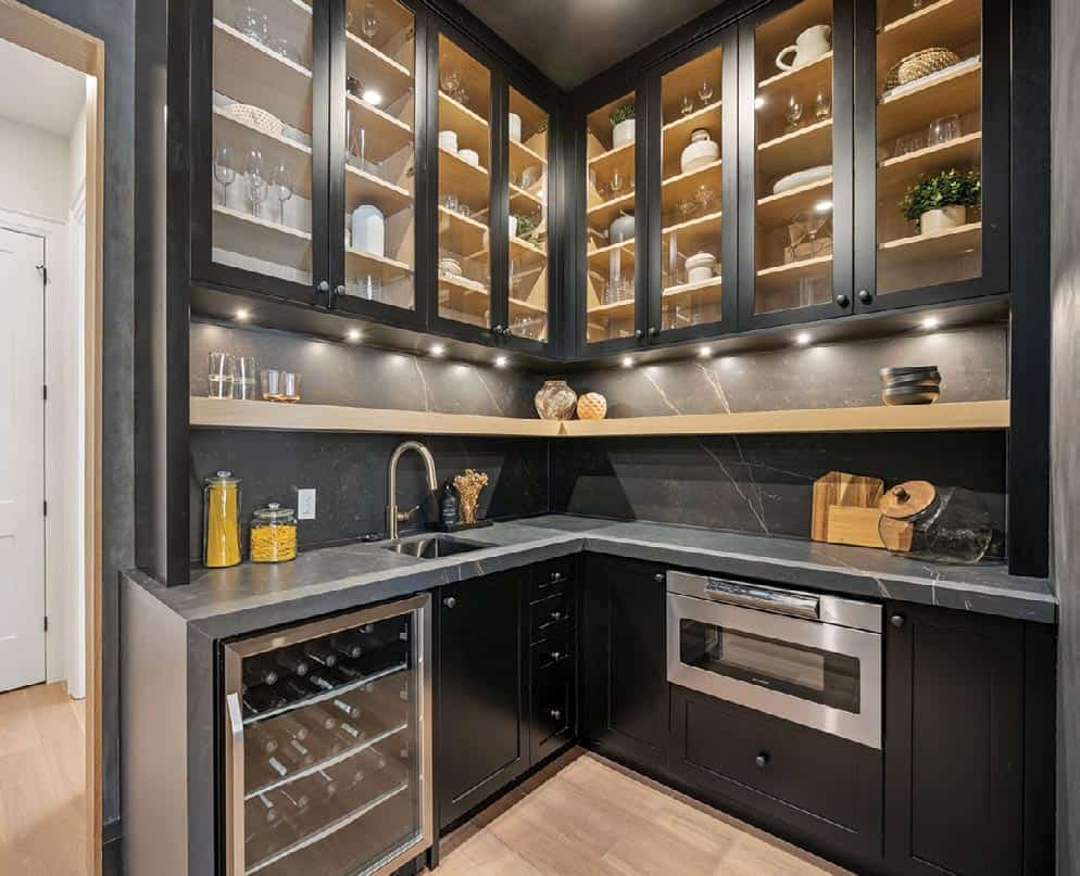 • The name Shadow & Grain reflects the dramatic stone island and wood cabinetry that extend to the ceiling, contrasting with black cabinets and wall behind the cooktop