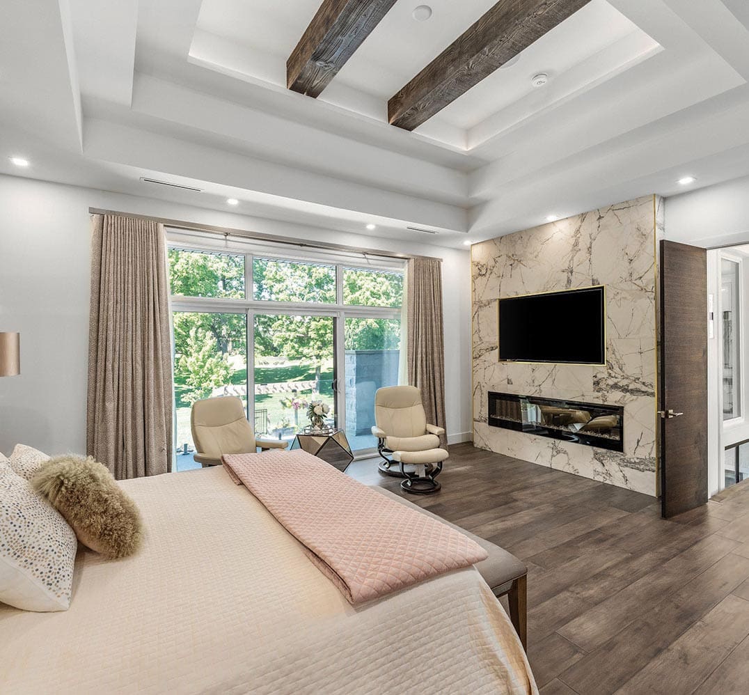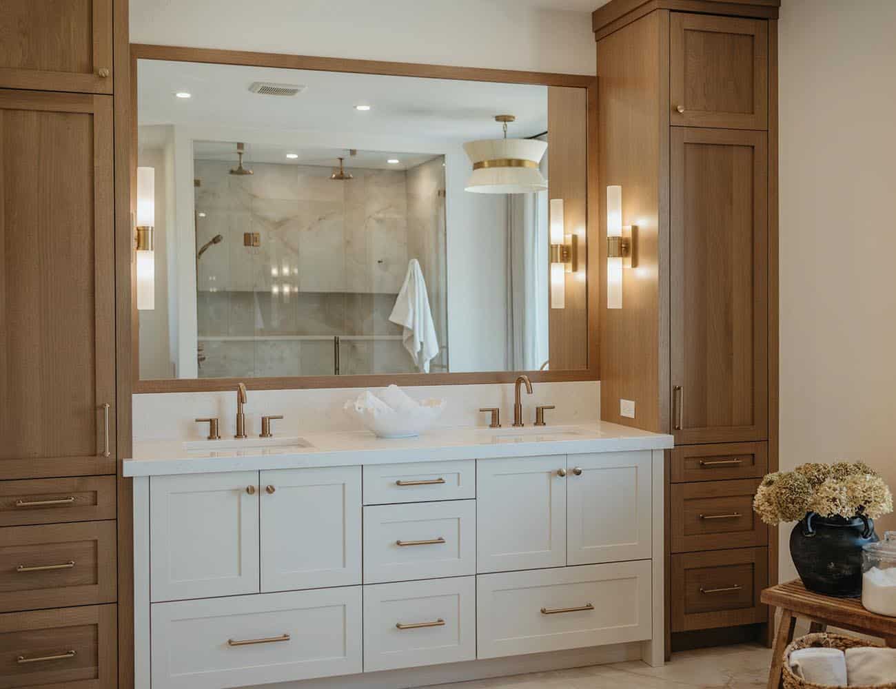 Kitchens and bathrooms remain the most popular spaces to renovate. Many homeowners convert their primary bathrooms into a day spa with standalone tubs and separate showers. One of the biggest trends is the “dirty kitchen” or back kitchen/large pantry. It keeps the mess of prepping and cooking out of sight. Built-in storage and seating are big. Cabinetry is moving from cooler whites to warmer off-white tones, with a mix of wood and paint or all-wood cabinets. Those woods are also darker now. The result is a more grounded feeling. People want spaces that are a cozy blend of practicality and harmony.