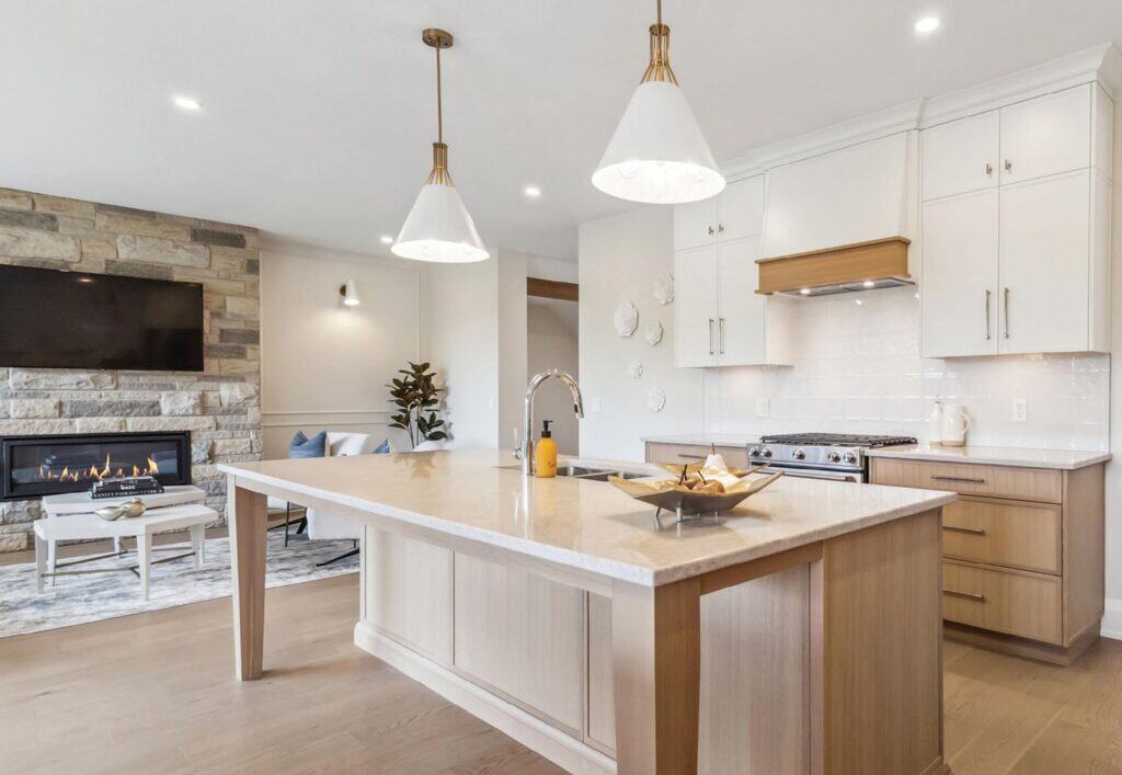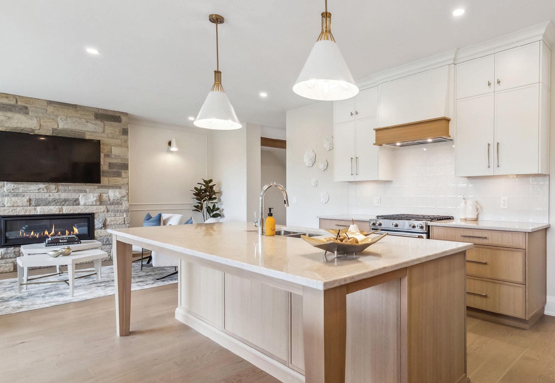 • A great room features large windows, kitchen cabinets in light wood and cream paint with a dark island and hood