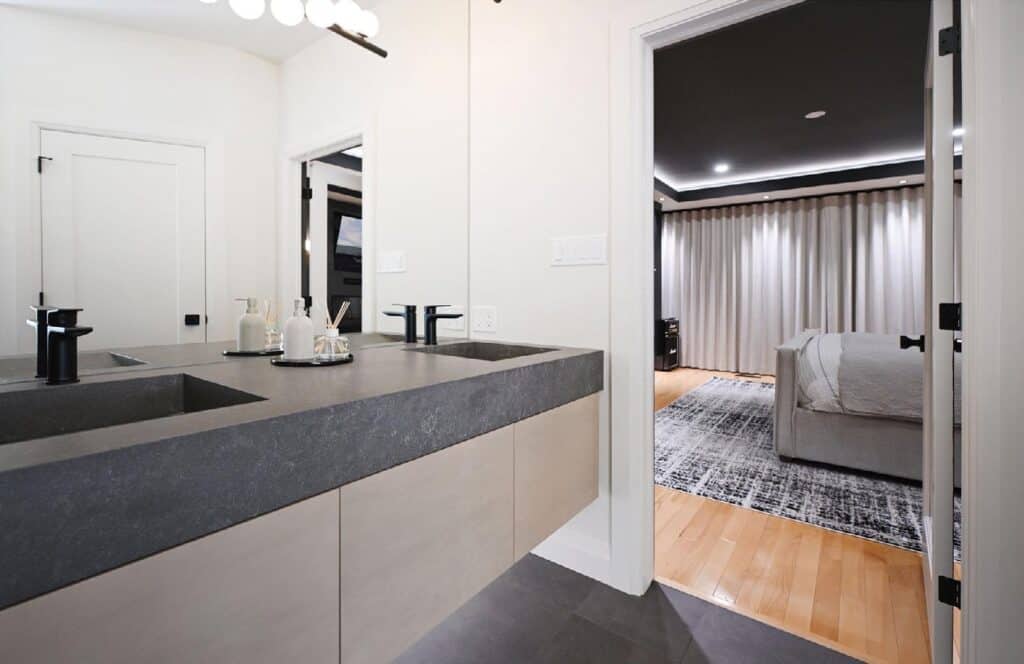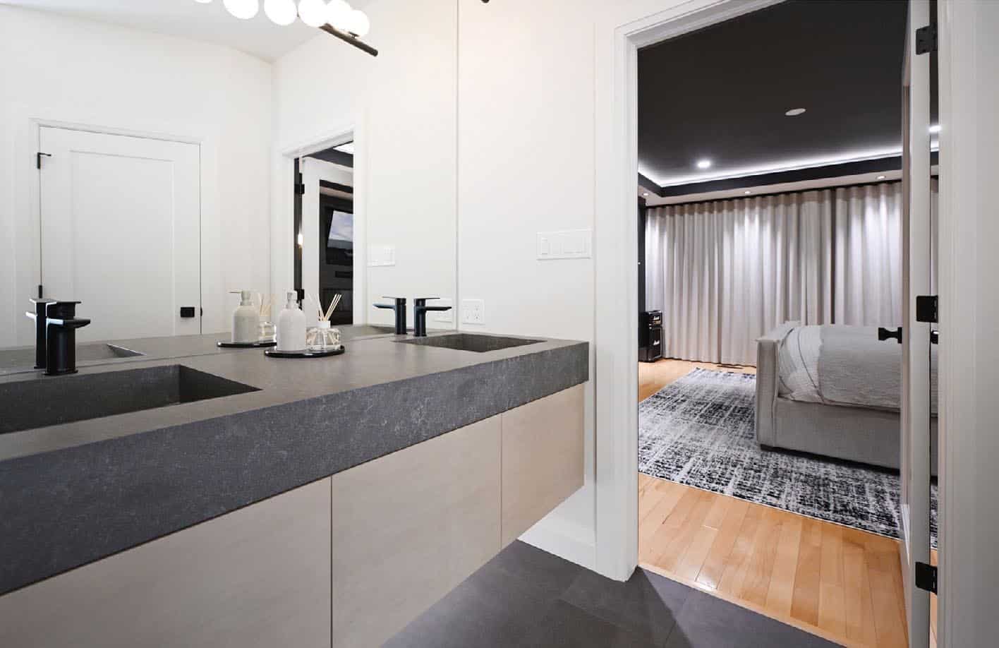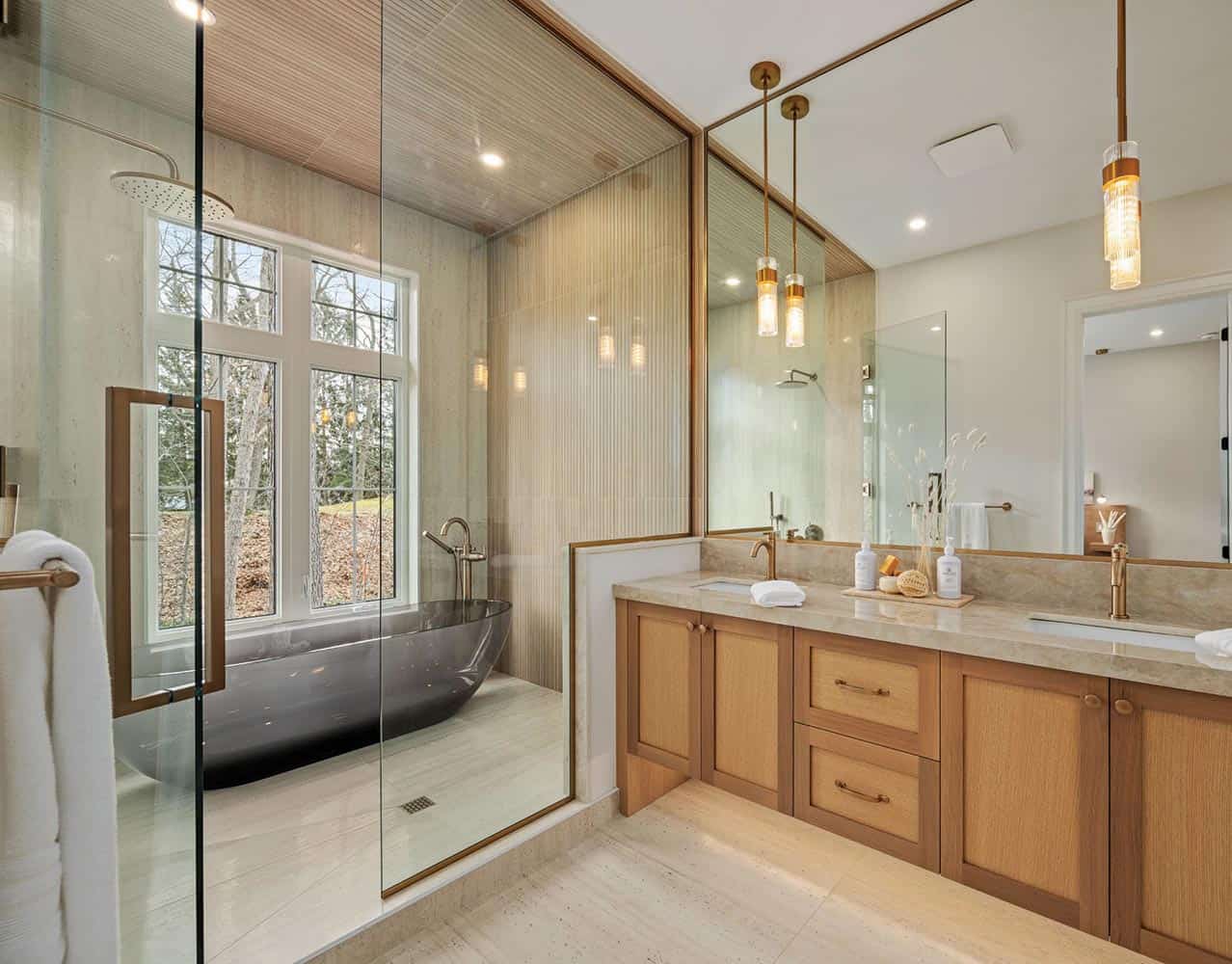 • A separate wet area includes the shower and a smoky grey tub under a large window for a spa setting
