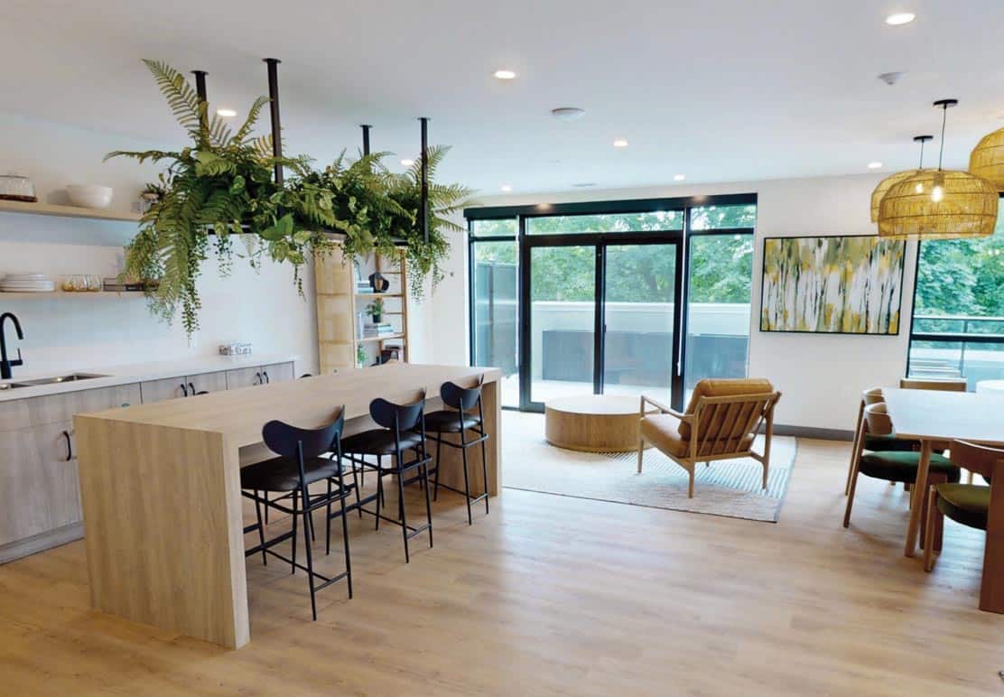• A common area exemplifies biophilic design with large windows, doors to a balcony, hanging plants