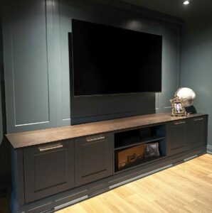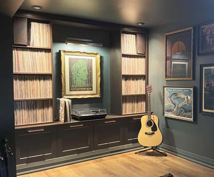 • Large-screen television, music area with turntable, shelving for the records, instruments and a gallery wall