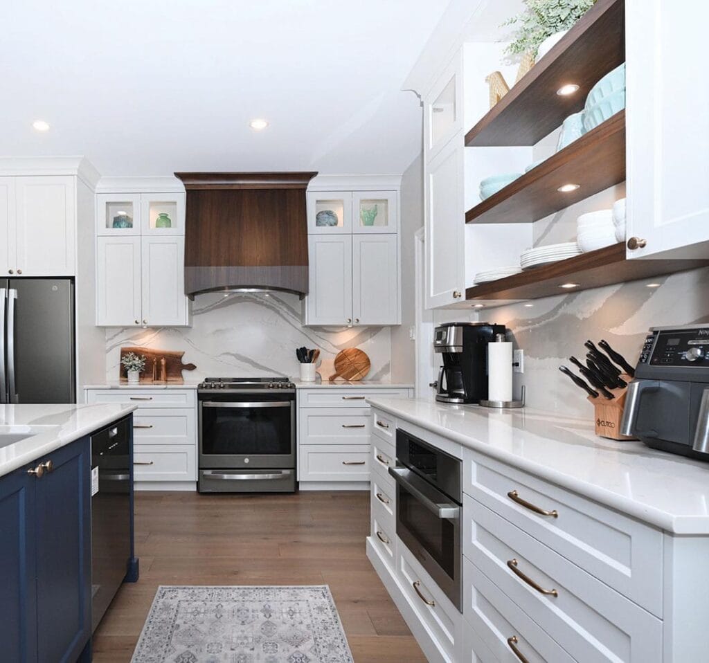 • White cabinets with wood-clad range hood, brass hardware and a deep blue island
